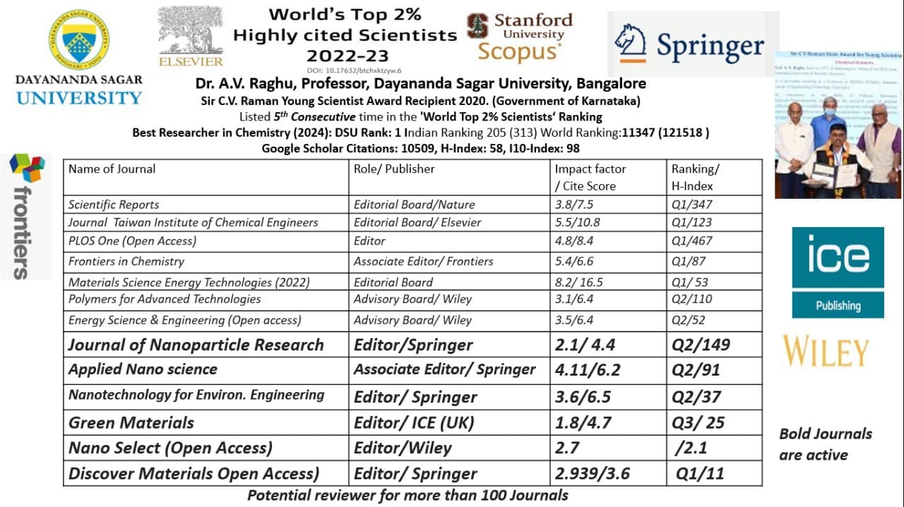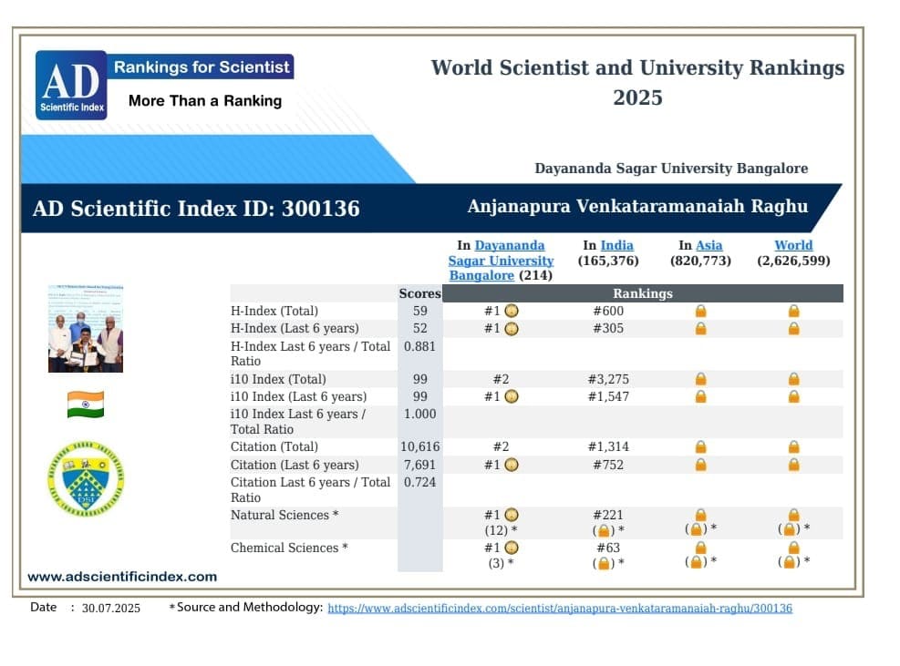 Dr. A. V. Raghu has been recognized as the top-ranked scientist at Dayananda Sagar University and holds the 600th position nationally in India, as per the AD Scientific Index. He also serves as an editor for multiple reputed international journals.
