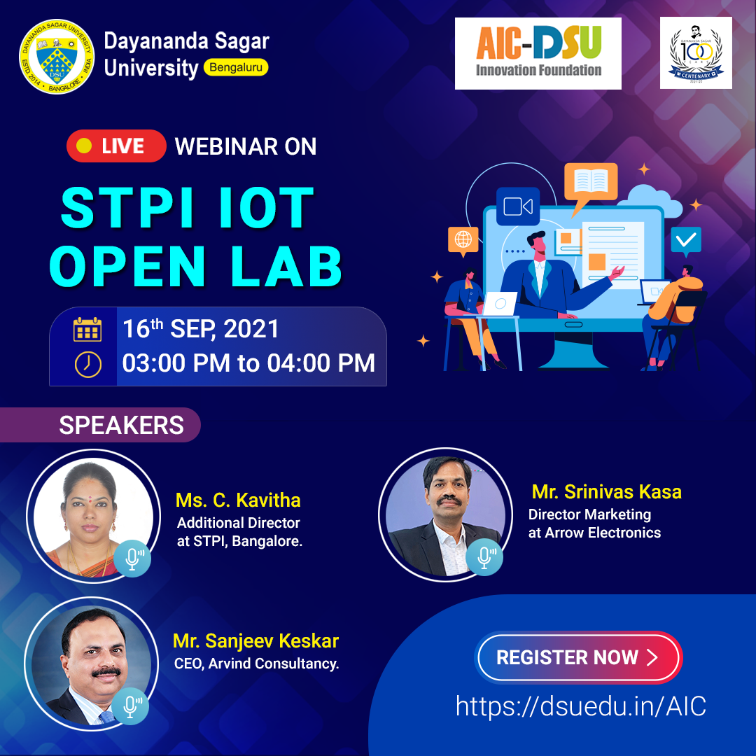 AIC-DSU Innovation Foundation is organizing an exciting webinar "STPI IOT Open Lab" on Friday,September 3rd, 2021 from 3 PM - 4 PM. This Webinar mainly focuses on startups accessing the world class IOT Open Lab equipped with Test & Measuring equipment, tools and sample bank of Electronics.